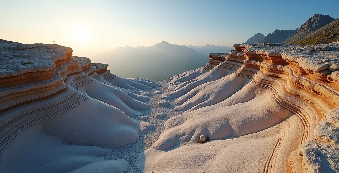 On entend souvent parler de la tectonique des plaques, de la plaque africaine poussant la plaque eurasienne. Ces concepts restent souvent abstraits, des schémas vus à l’école. Pourtant, les preuves de cette histoire titanesque sont là, sous vos pieds, à portée de main. Le défi n’est pas de connaître la théorie, mais de savoir la lire dans le paysage. Oubliez le cours magistral. La véritable clé n’est pas d’apprendre par cœur, mais d’apprendre à voir. C’est comprendre la grammaire des roches pour pouvoir lire le grand livre de pierre qu’est une chaîne de montagnes.